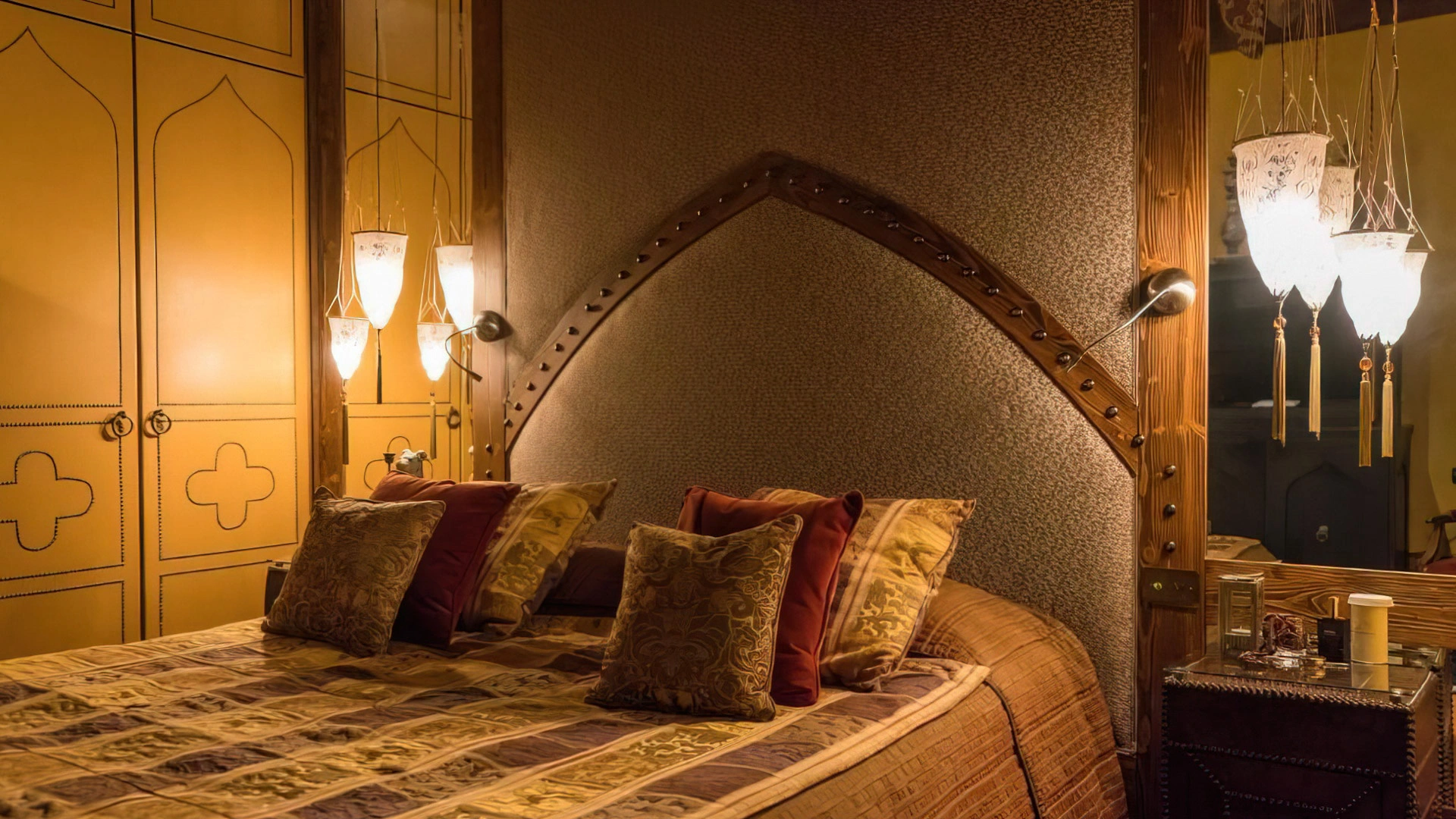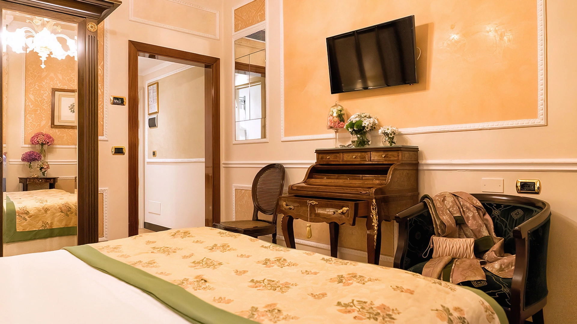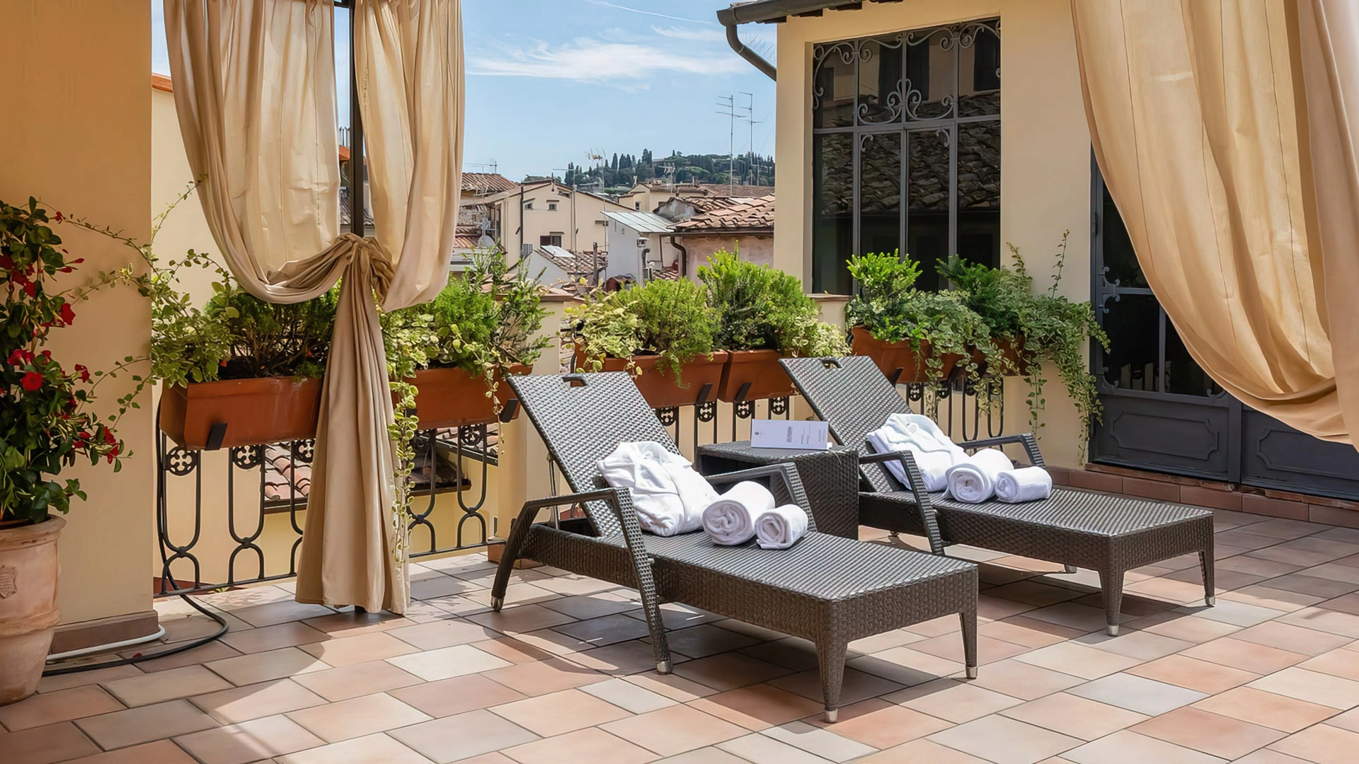 L'hotel dispone di camere e suite differenti per tipologia e stile, alcune con vista sul cortile interno e altre sulla città. Al primo piano si trovano 12 sistemazioni arredate in stile rinascimentale con pavimenti in cotto, soffitti con travi a vista, letti a baldacchino, arazzi e mobili antichi. Le restanti si presentano elegantemente arredate con tessuti pregiati, pavimenti in parquet e impreziosite da opere d'arte. Tutte le camere sono accomunate da comfort moderni come aria condizionata, cassaforte, frigobar gratuito, lenzuola in lino, TV LCD con canali SKY gratuiti, connessione Wi-Fi e bagno privato con doccia o vasca, asciugacapelli e set cortesia. In struttura sono presenti suites con area salotto e cabina armadio.