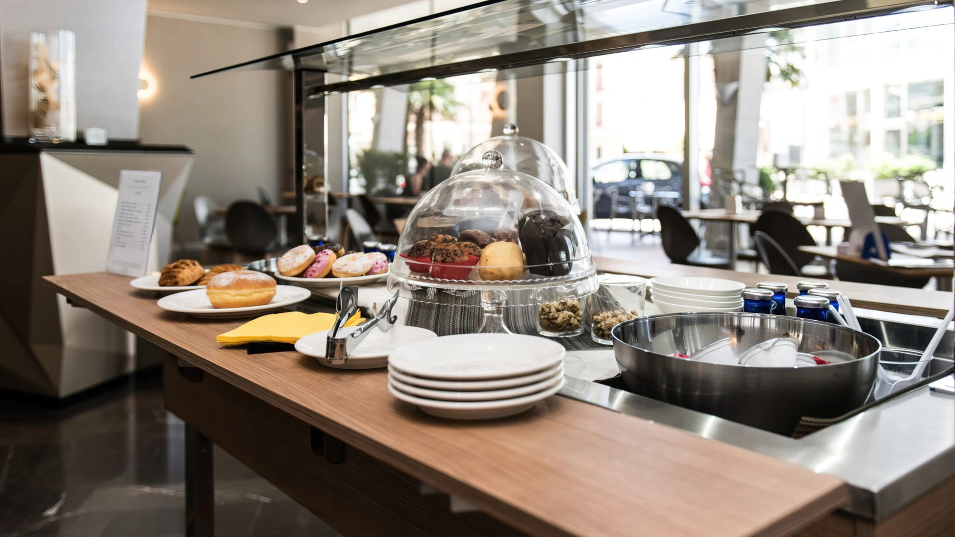 La colazione, servita a buffet, offre opzioni dolci e salate.